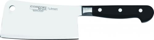 Die 15 cm lange Klinge ist aus einem Stück Chrom-Molybdän-Vanadium.Stahl X 50 CrMoV 15 geschmiedet. Das Hackmesser eignet sich mit der großflächigen, starren Klinge hervorragend zum Durchtrennen kleinerer Knochen. Der handsympathische Griff besteht aus POM Kunststoffschalen, welche durch Edelstahlnieten am Messer angebracht sind.
